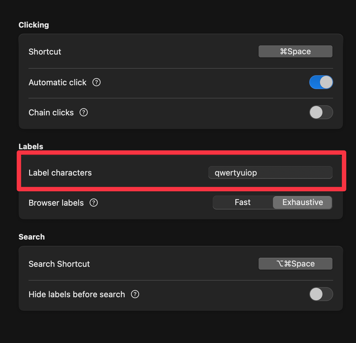 shortcut을 설정해 놓으면 맥 화면에 label이 생성이 되는데 이 label을 키보드로 입력을 하면 마우가 해당 위치에 이동하여 클릭 하는 동작을 수행 하게된다.